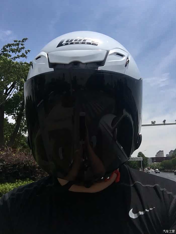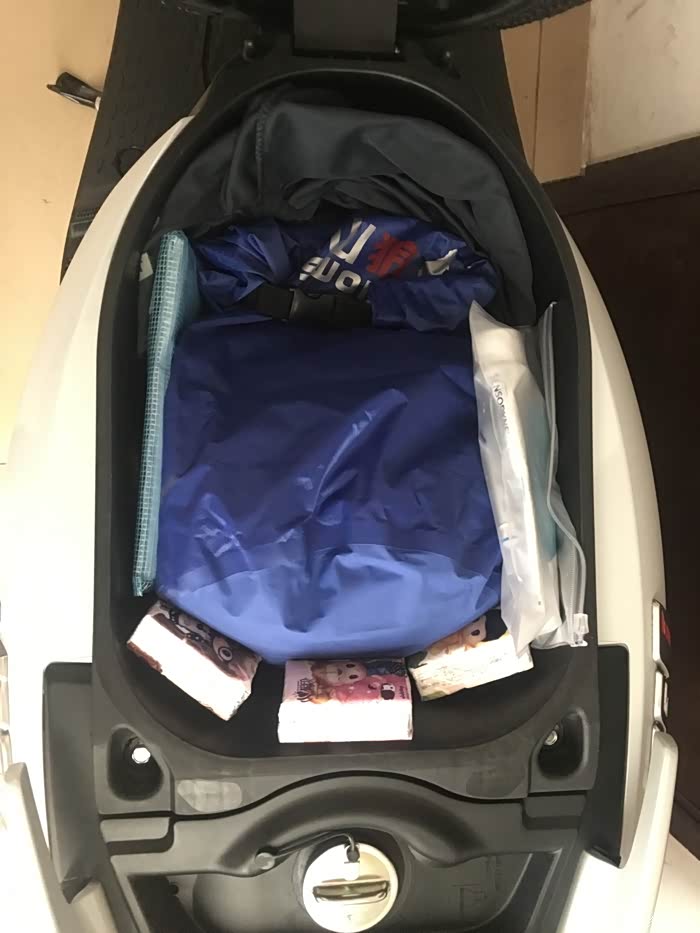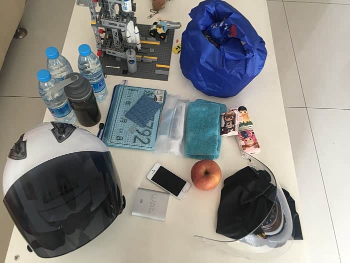 随车带的所有东西了。一个号称台产半盔,一个透明面罩,资料袋,水,衣服,充电宝,纸巾,苹果一只。