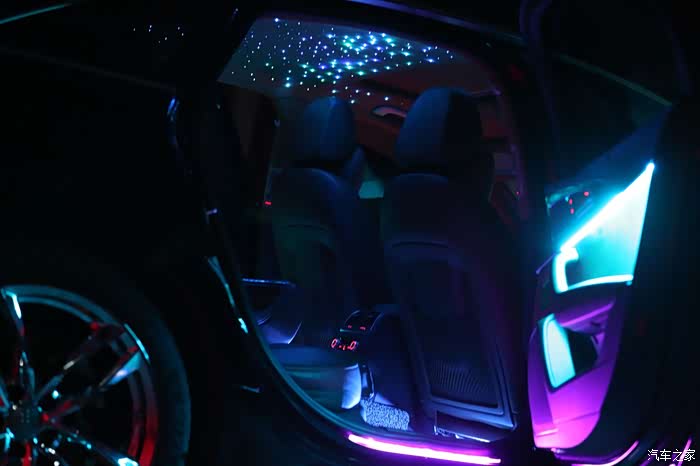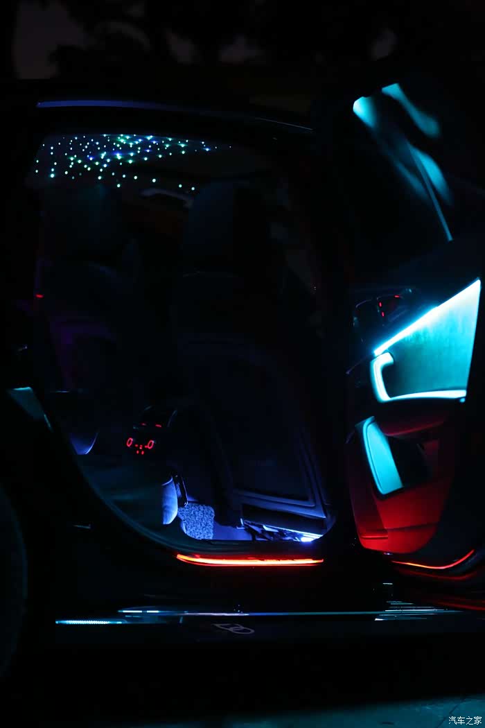 氛围灯+星空顶,纯粹是为了装B和好看,没有任何实际意义。在我所有改装项目里也是最费时间,工程量最大的。需要拆四门板走线和原车白色织物顶棚。