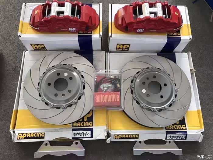 硬货来了,全进口AP Racing 8520大六活塞刹车套装,搭配AP 380mm划线刹车盘+AP刹车片,7075材质合头桥码、HEL钢喉以及AP DOT5.1刹车油,安装过程不赘述了,拆原刹车套装(包括卡钳、盘、片、油管),最后排空油管空气。