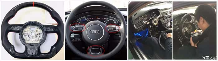 安装时候,需要拆卸圆形气囊,并且把换挡拨片的线束、左右多功能按键及下面的烤漆饰板(图中打圈)在原方向盘上拆卸,替换到新盘上。装好路试,明显发现比原来转向更加灵敏轻便并且转向清晰,奥迪原厂转向都存在指向模糊,电子味很重的感觉,但是新盘子给我的直观感受就是转向灵敏度和指向性都有大大的提高,最重要一点,精致的碳纤维做工和符合人体工程学设计的3、9点打孔凹陷真皮握点,给你一个顶级的视觉和触觉的享受,对于我这辆3.0TA6的驾驶欲望也变的更强了。拥有了这个方向盘,现在开车就是一种享受,太超值了,强烈推荐车友们入手,从此开车手握方向盘就是一种享受,绝不后悔。
