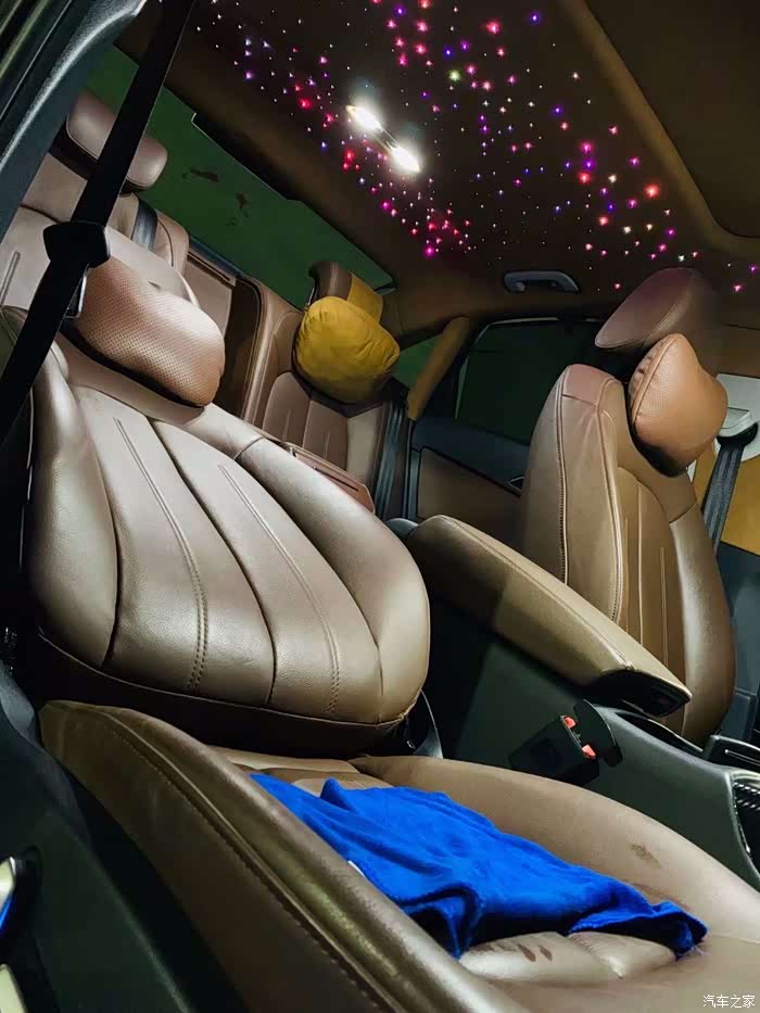 星空顶的安装过程是在原厂白色织物顶棚拆卸的基础上,配合我的棕色内饰,包上棕色翻毛皮,这里说下,主流实惠的顶棚包皮以日本东丽皮居多,手感和视觉效果很不错,然后再高端的就是顶级跑车自带的Alcantara翻毛皮,均价1w+,当然手感也是无与伦比的。非常贵所以我没考虑,等皮包好,随后就是在顶棚上扎密密麻麻不规则的小洞,用头发丝细的光导纤维插进去,最后就是把多余的纤维体减掉,打上胶水,装车通电完毕。预算充足的车友,还可以定制流星划过+星座图案,我的是最普通的多色渐变星空顶,没有任何图案。自带遥控器,可以控制,只有通电情况下会点亮。