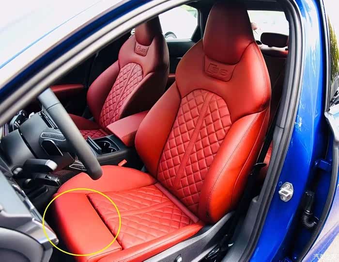 2.在原座椅基础上,前排座椅更换S6座椅骨架,全车五座包nappa红色菱形纹真皮,四门板包红色真皮 价格上后者是前者的一半,预算有限并且对年轻人来说,红色更具运动感,我还是比较亲睐后者。至于为什么不顺便做仪表台真皮,因为我嫌拆车心疼。效果如下: