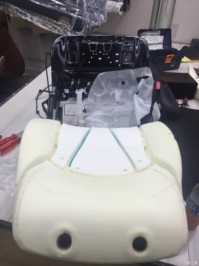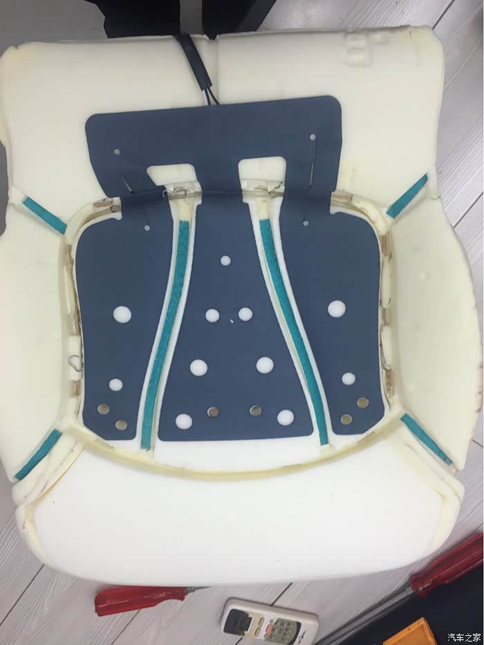 重点的来说吧,1、小昂的座椅加热功能不是那种加热圈的,而是一整片的那种,比较高档,但变得不好加工了,加热圈的只要搞几个洞就能通风,而这个如果要搞要把加热片小心的划出一条条空隙再拉开有空间,让其能通风,我是觉得太麻烦,加上我们南方用不到加热功能,就把整个加热片给拿下来了。