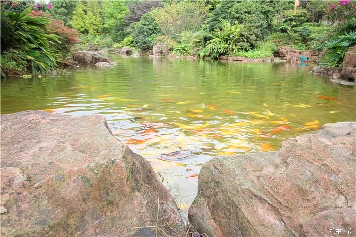 屋外的池塘中一群群锦鲤游来游去,生意盎然。