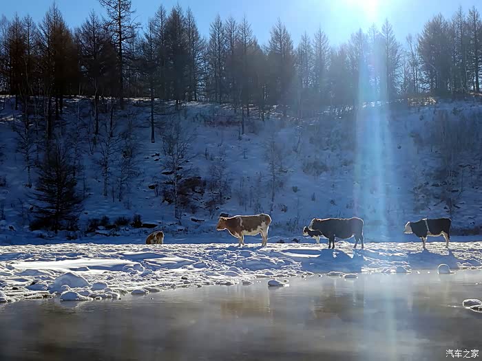 小牛信步在不冻河边,啃着水草、饮着温暖的河水,悠然其间