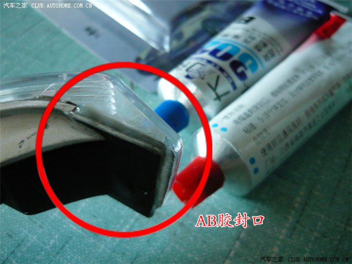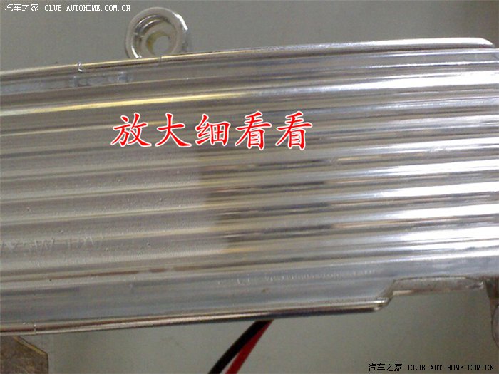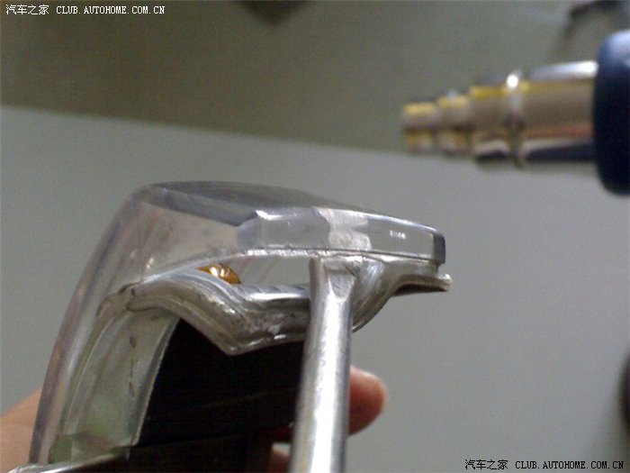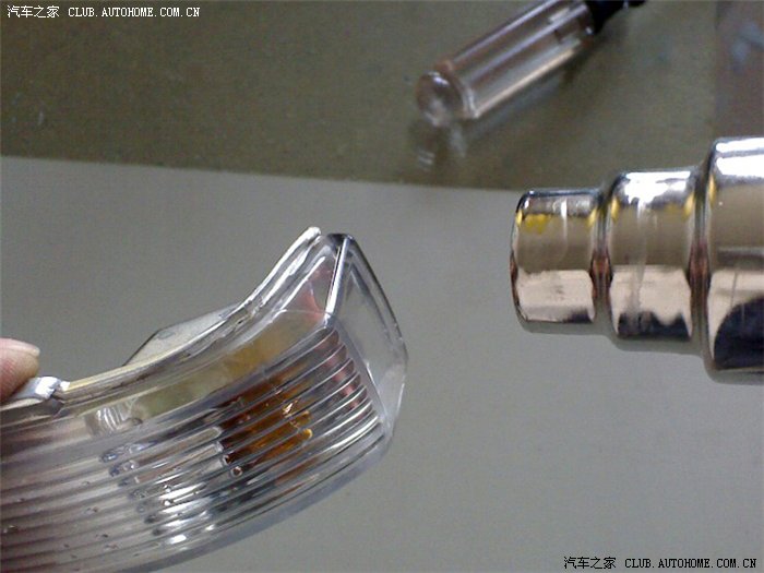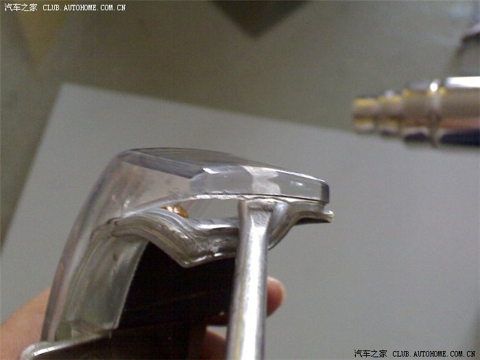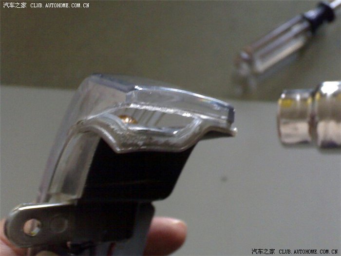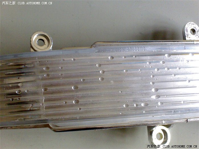 五、取下转向灯后仔细观察,发现转向灯外壳靠近灯边缘处明显有一小缝隙,洗车时水就是通过这个缝隙进入转向灯内部的,甩动转向灯后内部的小水珠流动通过这个小缝隙逐渐渗出,由此也证明了这个缝隙的存在。另外转向灯外壳和底壳之间是用什么热熔胶之类的东西封闭粘合的,如果采取硬撬的办法分离外壳,一旦外壳破碎将会造成无法弥补的损失,这也是多数修理人员不愿意修理的原因之一;