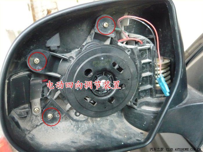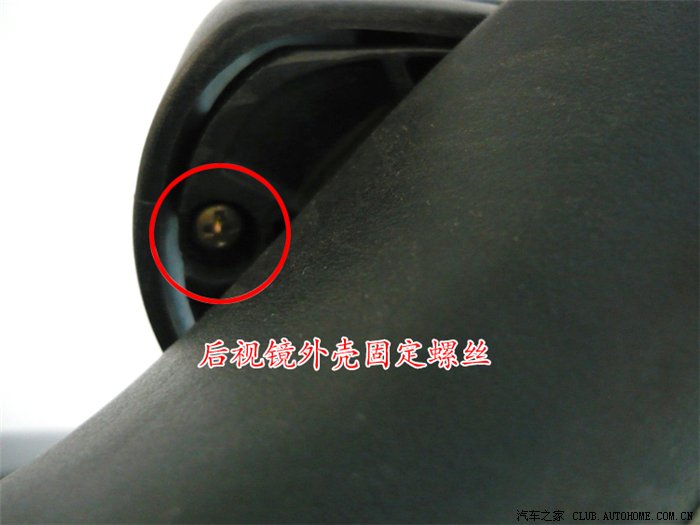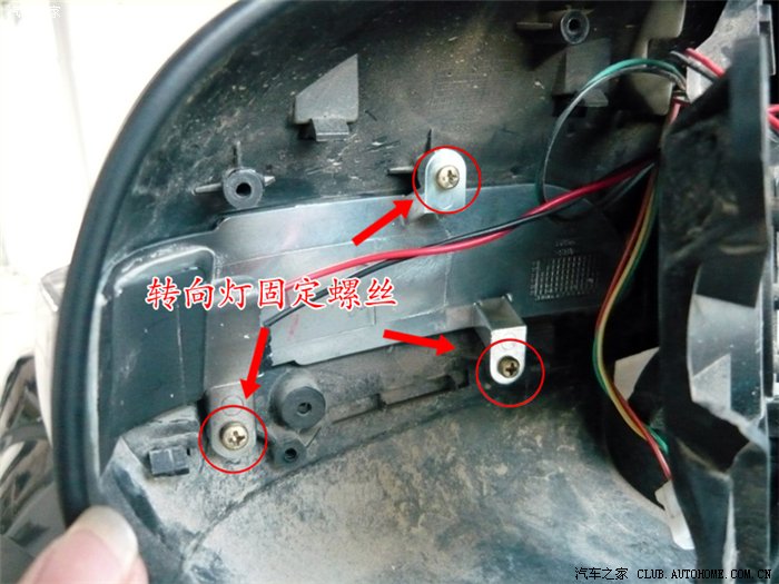 三、用十字改锥拧开固定后视镜四向电动调节装置的三个螺丝,注意固定后视镜外壳的螺丝也要拧下,其位置在后视镜收折后端下方,取下这颗螺丝后向后推开后视镜外壳,就可以看到转向灯背面;
