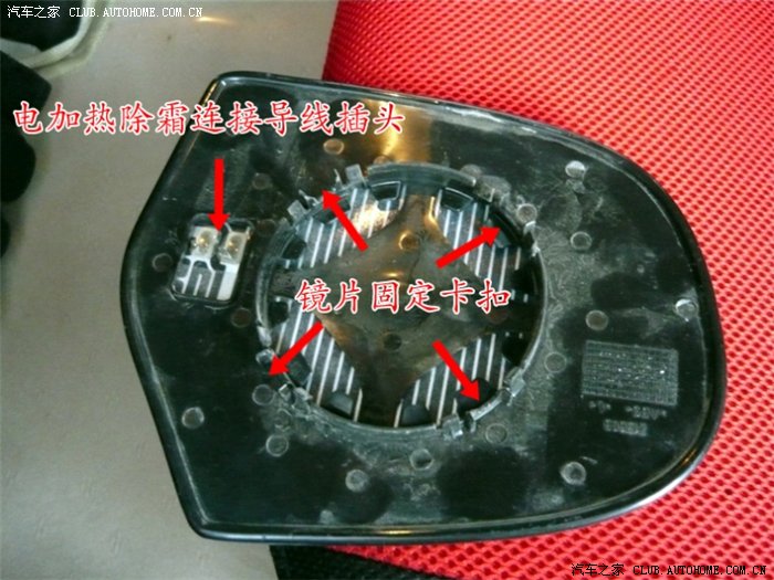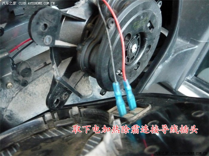 二、用手指压住后视镜加热除霜导线接头后,取下加热除霜导线,放好后视镜片;