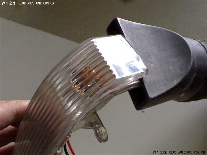 七、轻晃转向灯尽量使水珠甩出可以缩短干燥的时间,干燥的办法有三:1、用一细铁丝缠少许棉花然后伸进转向灯擦拭,由于转向灯内空间狭小加之有一定的弧度,操作起来很费劲,弄不好会把转向灯泡碰掉,放弃;2、自然晾干,如果有时间这种方法最稳妥,把打开口的转向灯搁置在安全的位置一二天,干燥后装回即可,由于我要天天用车,此方法放弃;3、热风枪温度设定在100度以下(或用电吹风冷风档)对准开口进行吹干,由于撬开的开口过小,空气不对流,所以即使这样吹也要等一个小时左右才能干燥,所以一定要有耐心,把留在转向灯内部的水珠和潮气完全彻底的除去后才能进行下一步;