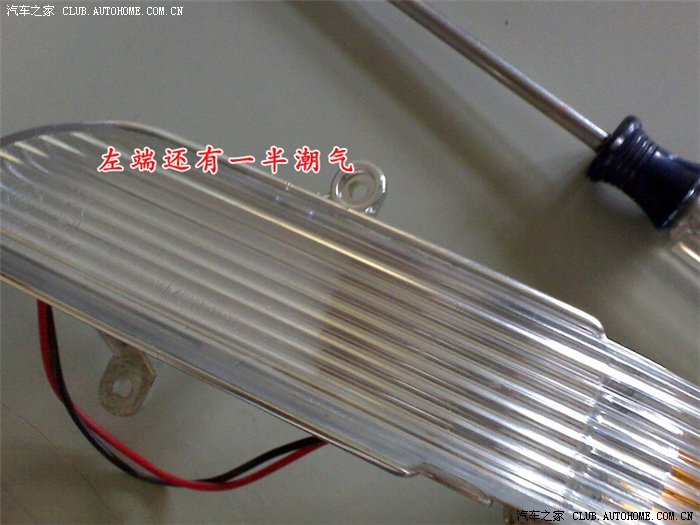 找了N个汽车装饰店和修理厂准备让他们来处理掉左后视镜转向灯进水的现象,不幸的是均告知无法处理,一经拆解后就无法复原从而造成后视镜的损坏!除水珠必需换后视镜总成,包括安装需要300元左右,想想为了水珠换一总成不值,所以就准备采取自然干燥法,结果一个多月过去了,后视镜中的水珠丝毫未变,即使在强烈阳光的曝晒下也没有减退的迹象,自然干燥法宣告失败。