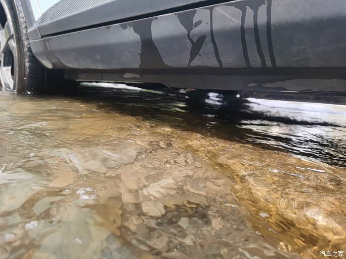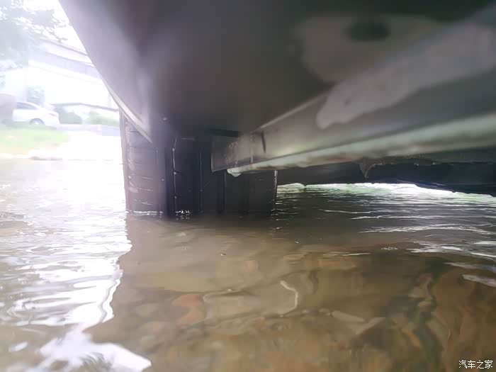 近距离看下水位,轮毂下部已经淹没。