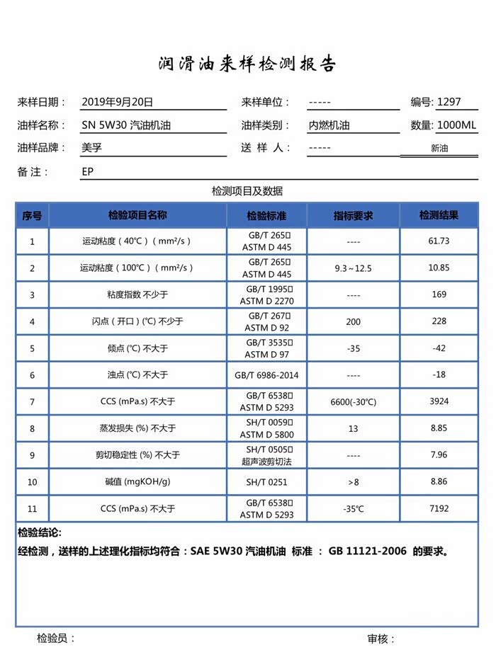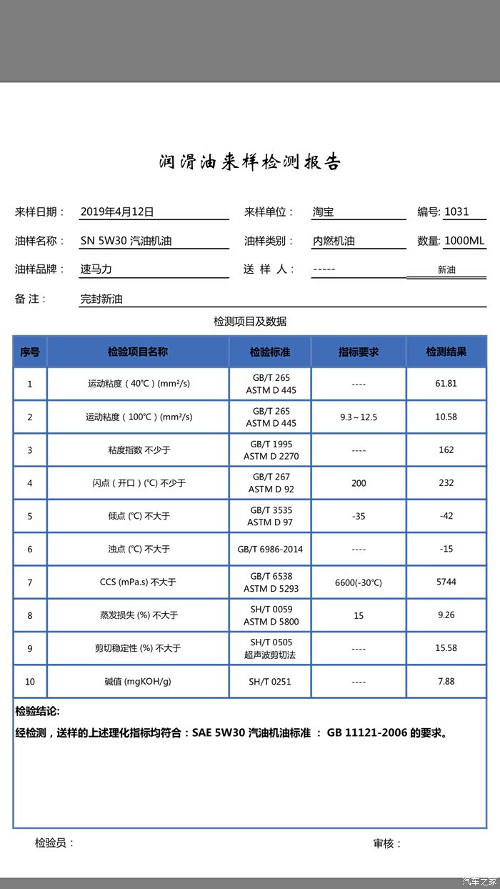 ,今天偶然发现就发出来吧,目前只有一个报告和一张图片,其他信息都找不到了,仅供参考。本次检测只对样品负责,样品由车友提供的1升装未开封新油。