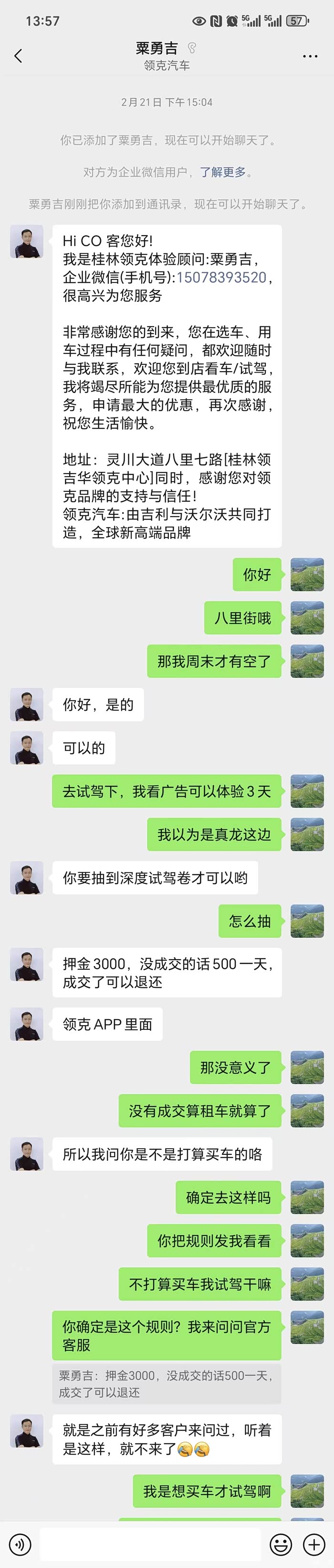 领克官网宣传可以深度试驾体验3天z10,让我在网上登记了信息,4s联系我又说需要支付500元每天试驾费用,成交可折抵车款,不成立就算租车费!欺诈消费者!