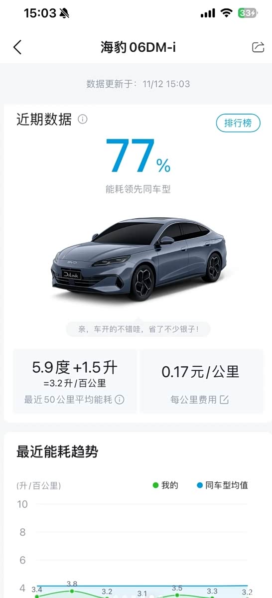 PS.我这辆海豹06DM-i是混动车,有着120公里的纯电续航,平时的话,120KM的纯电续航就能满足我的出行需求啦,而且充满一次电也就只要14元左右,所以当电车开真的很省!最后提下油耗,那是相当的顶!前几天放假的时候,开车带着朋友去郊区BBQ,切了HEV模式,近50公里油耗也就3.2L,夸张点说,我这一箱油能开到过年了!