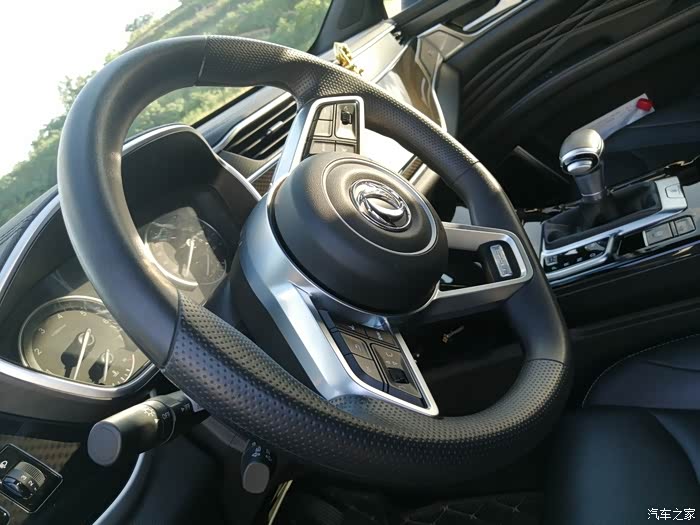 材质是皮质的多功能方向盘,手感不错,不重不轻的那种
