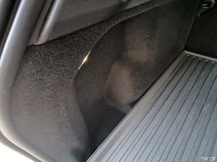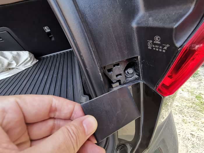 发现一个小秘密:后备箱打开后左右两侧各有一个小小的盖片,拿下盖片之后发现下面隐藏着一颗螺丝,这应该是后保险杠的固定螺丝吧?