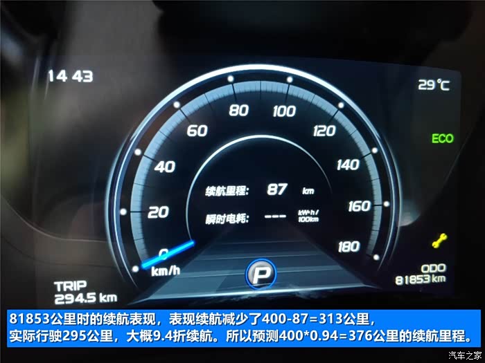 81853公里,表显续航少了313公里,实际行驶295公里,等于9.4折续航,预测400*0.94=376公里总续航。