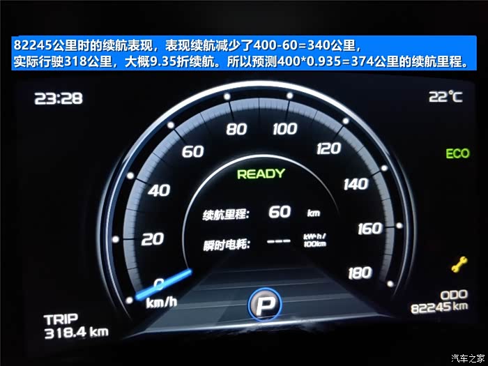 82245公里,表显续航少了340公里,实际行驶318公里,等于9.35折续航,预测400*0.935=374公里总续航。