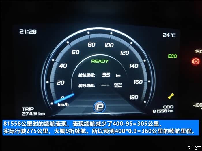 81558公里,表显续航少了305公里,实际行驶275公里,等于9折续航,预测400*0.9=360公里总续航。