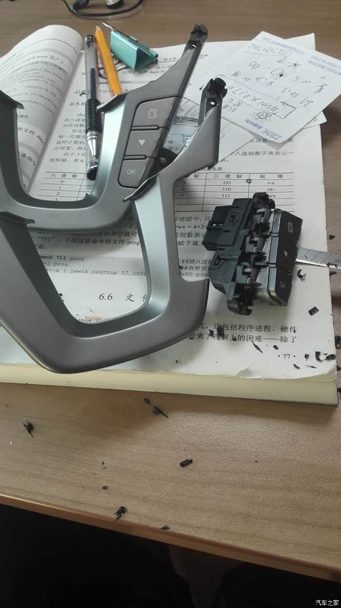 两个按键有差别,原车的安装到副厂螺丝塑料扣大小不一样,没办法,DIY,直接上壁纸刀,各种削