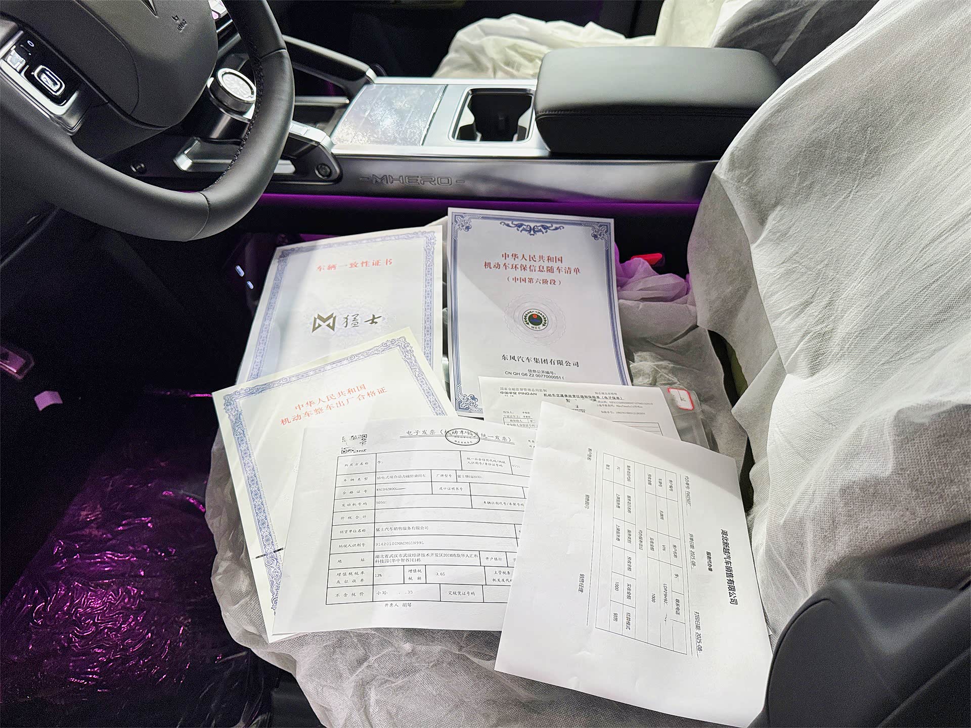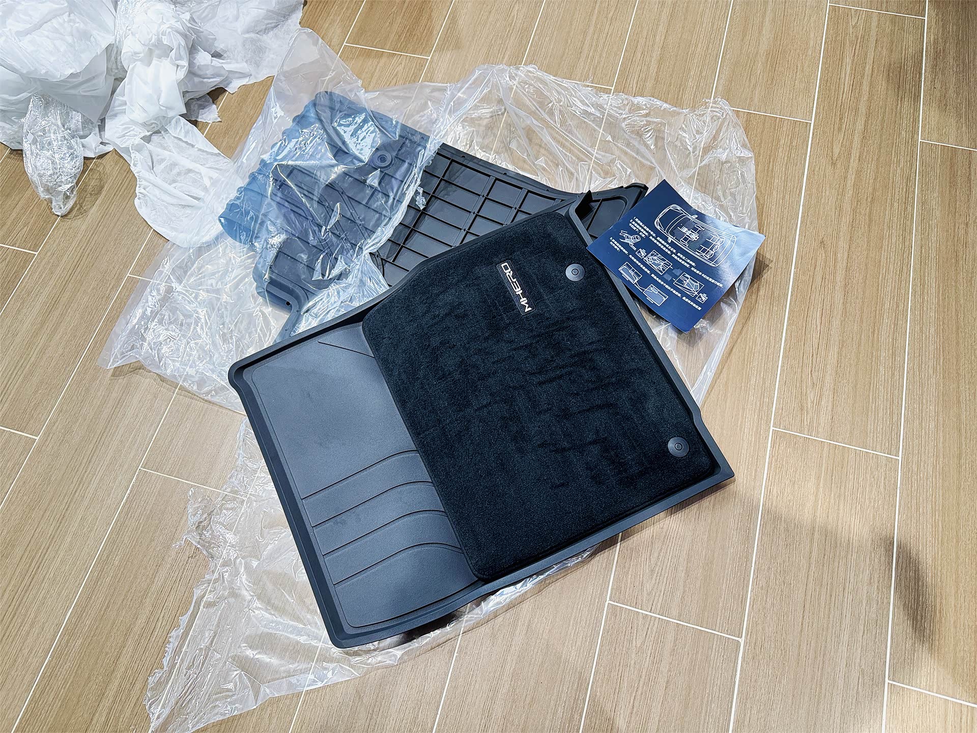 去提车时一直在下雨,验车就在车间里简单的看了看,外观无磕碰掉漆、内饰各种膜、套都完好,撕膜撕套这种活必须我亲自下手。门店的小哥提前帮我在车底拓了车驾号,车前箱子里放的原厂双层脚垫,质量看着还挺好。