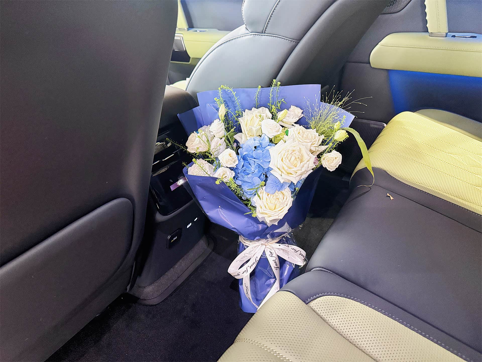 手捧花也是赠送的,略香略香!后排空间和后备箱空间都很宽敞,地台也是平的,很棒,后排座放倒后是个平面,临时休息很实用。