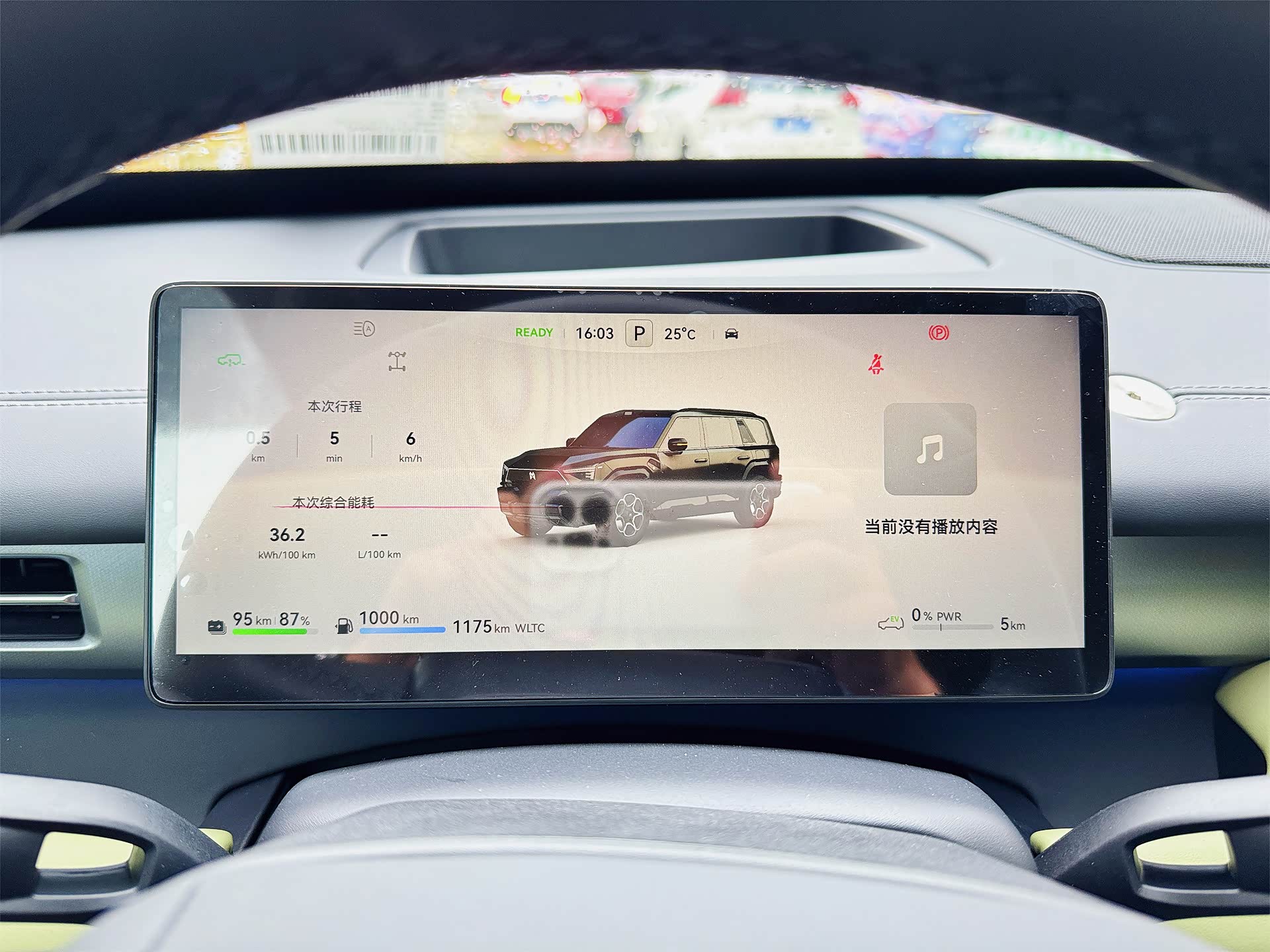 满油状态仪表显示油续航1000公里,电续航剩余95公里,总续航里程1175公里,我数学不好,没想明白。右边的总行驶里程还是5公里。