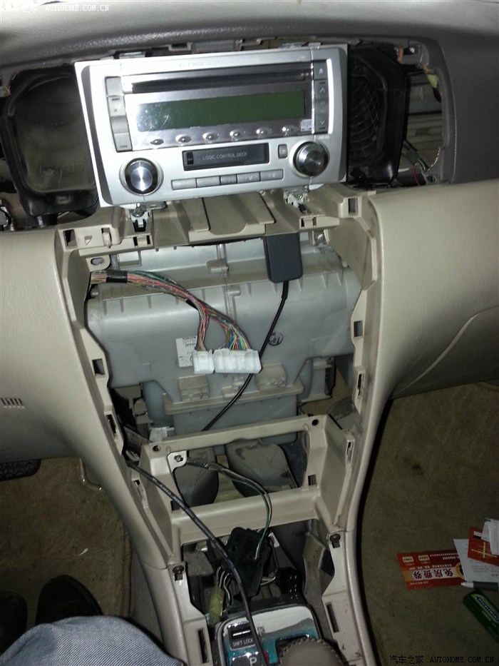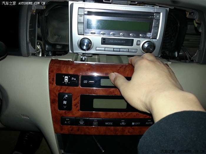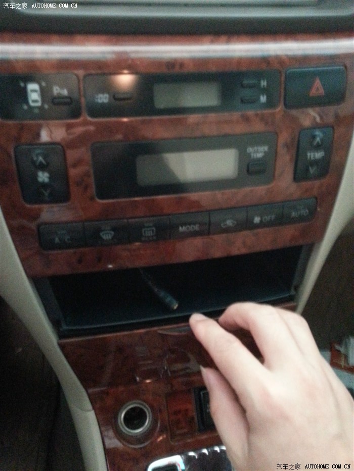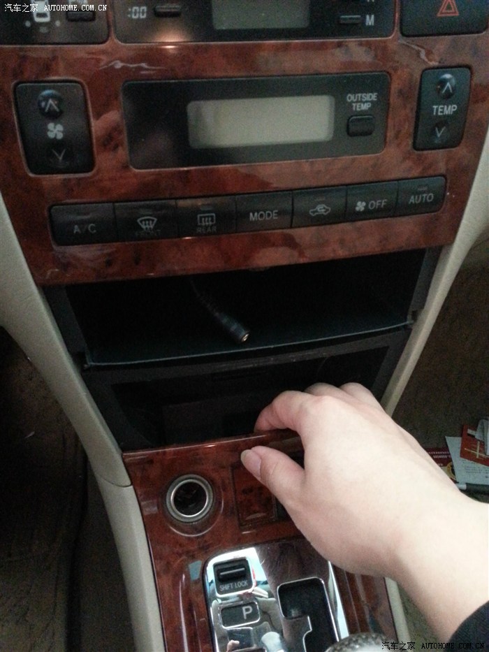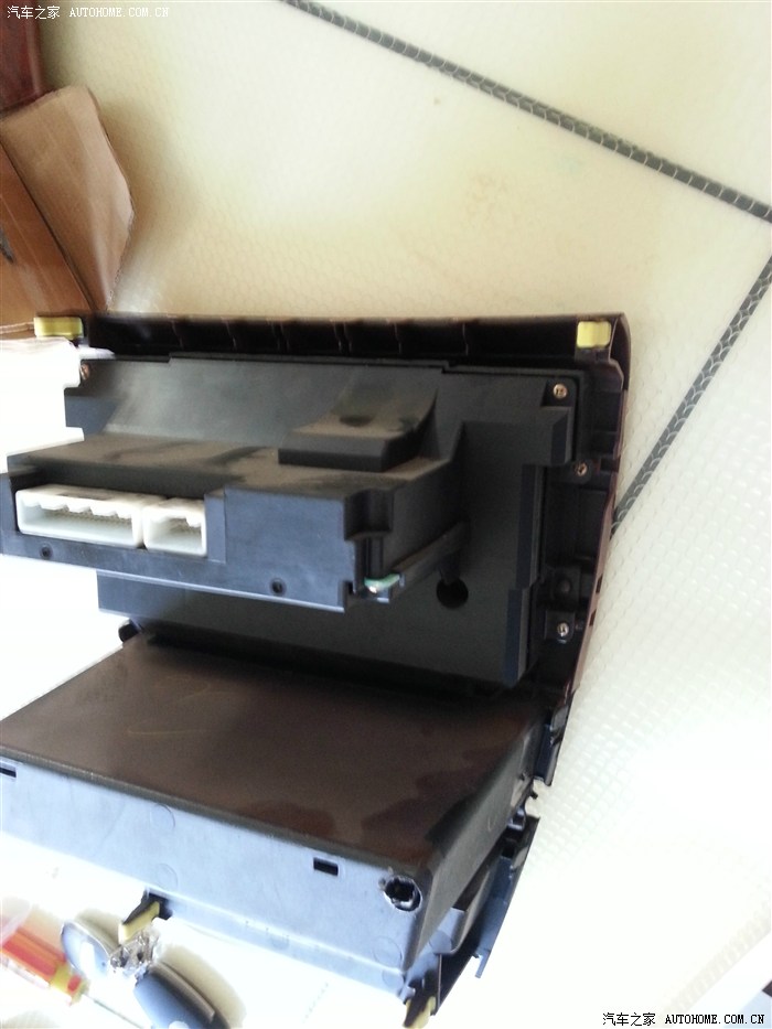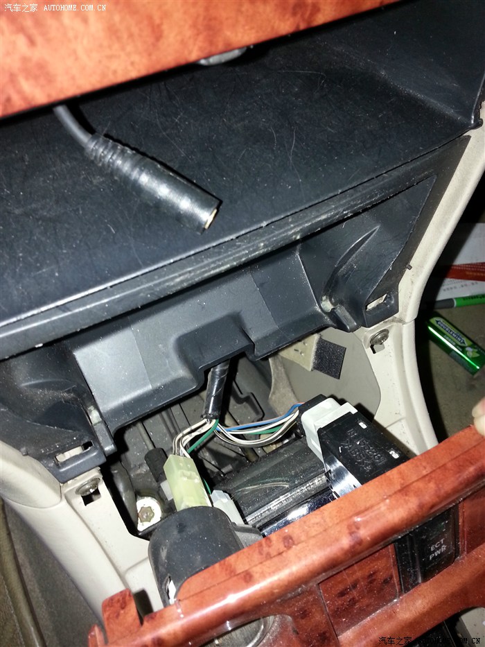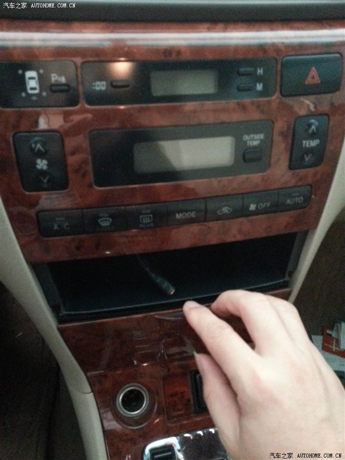 把点烟器及各开关接头拔下。储物盒里接头是自己加装的AUX接口,可接MP3。