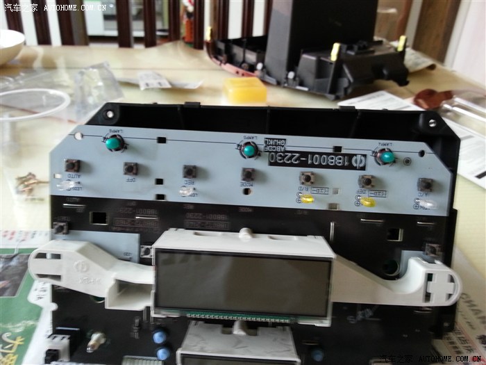 这是换好后的面板正面,由于一个人,施工过程不好照像。就是用电铬铁把开关脚边上的锡铁熔化,取下原开关,再装上新开关,铬上就可以了。总共换了12个,图中上面一排七个,还有风量两个,温度两个,室外温度显示一个。出厂是安装下图下部那蓝色的像皮按键,用不了好久,不能修复,优点是按起来没有声音。