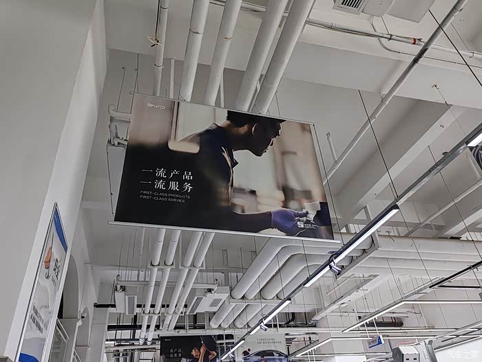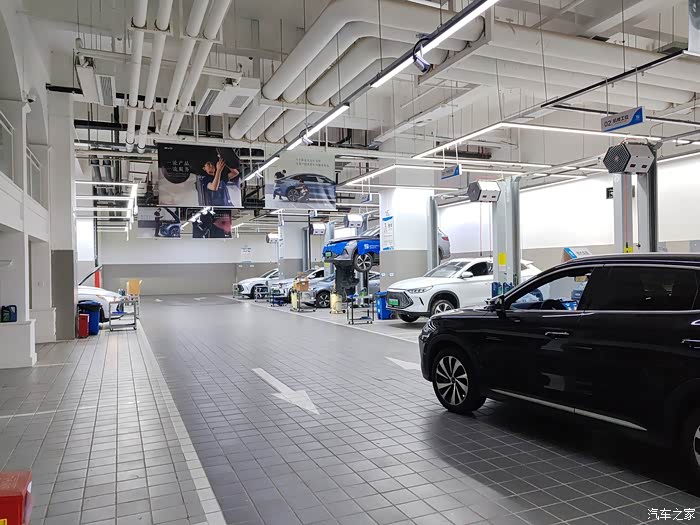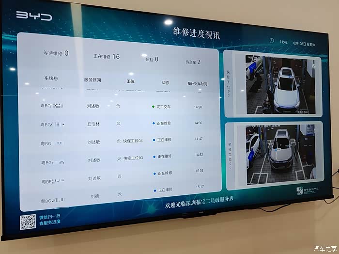 而且在休息区的可以通过显示屏观看等待维修进度视讯。不得不说比亚迪体验感拉满。