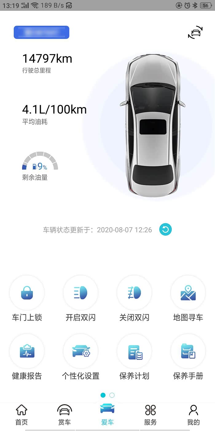 APP 也不定期的会更新,此图为最新版更新版本,首页更新了爱车的基本状态,油耗,里程,剩余油量