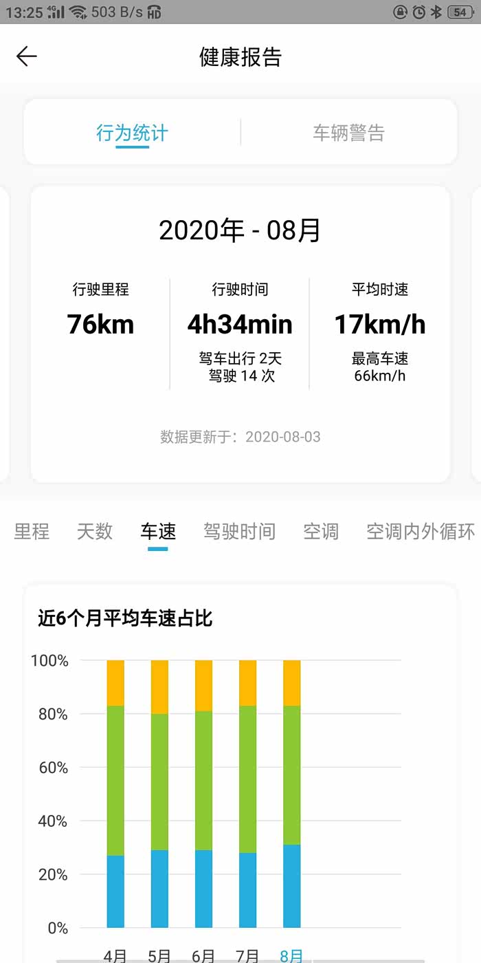 健康报告,可以很清晰的看到你用车的各种信息,包括天数,里程,车速,驾驶时间段,空调等信息