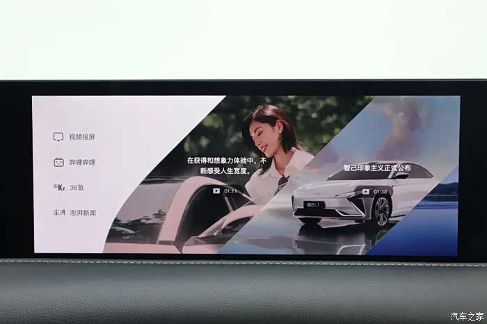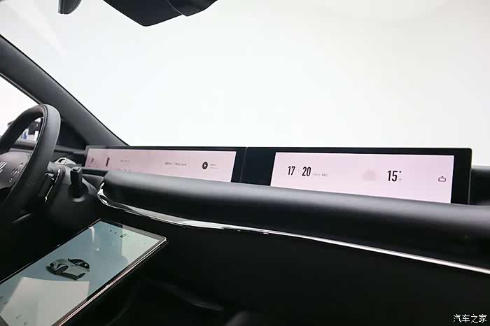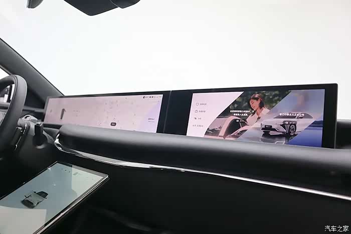 仪表台上是两块屏幕,一块26.3英寸超大液晶屏和一块12.3英寸副驾驶娱乐屏。这两块屏可以电动升降,界面也会随之变化。
