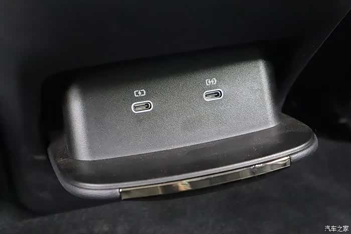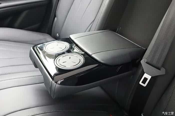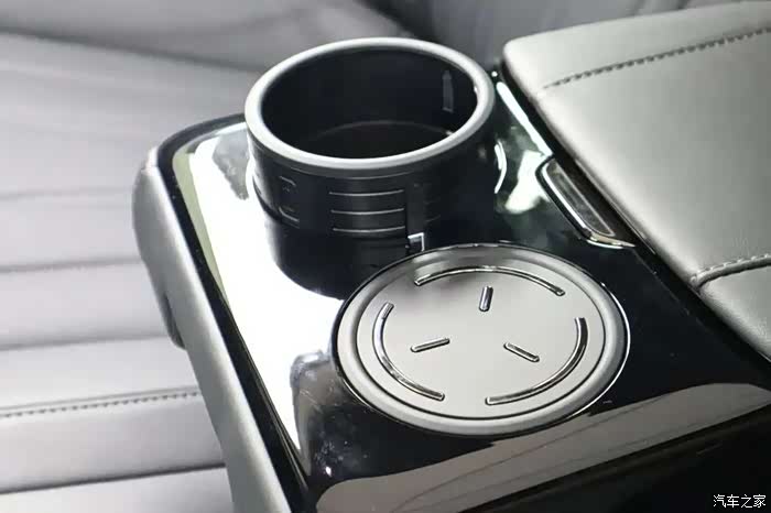 后排中央扶手比较有意思,水杯架是一个非常新颖的机械结构。下压,水杯架四周升起;上提,水杯架自动收起,这种结构在其他车上从未见过。