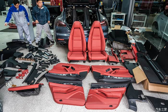 此次的改色方案比较特殊,用通俗的话来说就是所有干邑色的部位全都需要进行改色,包括门槛嵌条、ABC柱饰板、顶棚、后备箱等,这就涉及到一个问题,原厂的塑料部件需要进行喷漆处理,让最后的作品无限接近原厂的黑色/carrema红配色。我们知道包全车内饰一直以来都是异常庞大的工程,涉及到的拆装项目也是非常的多。 先不说内饰包覆的工艺如何,拆装工艺都是十分考验改装厂,一个熟练的保时捷改装店才能做到熟练地拆装,很多车主朋友在考虑内饰改色之前都会需要我们确定在完工之后车辆不能出现异响,而这对于经历了几十台保时捷全车内饰拆装的我们来说,异响的问题是完全不用担心的。