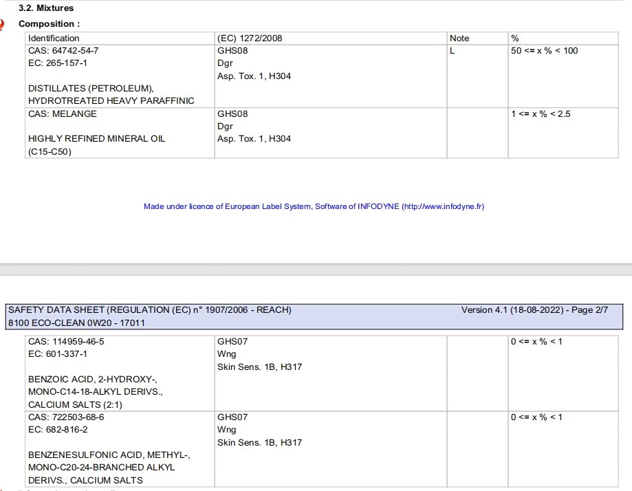 PDS更新至22年10月,SDS更新至2022年8月18日,披露三类为主,含钙基清净剂,清洁方面拉满,符合CLEAN定位;