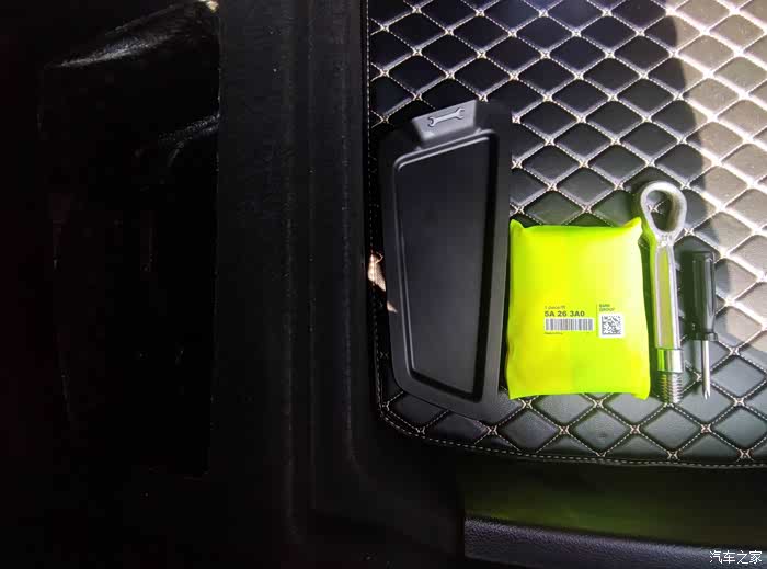尾箱左侧储物格的随车工具:工具槽盖板、反光衣、拖车钩、十字一字二合一螺丝批