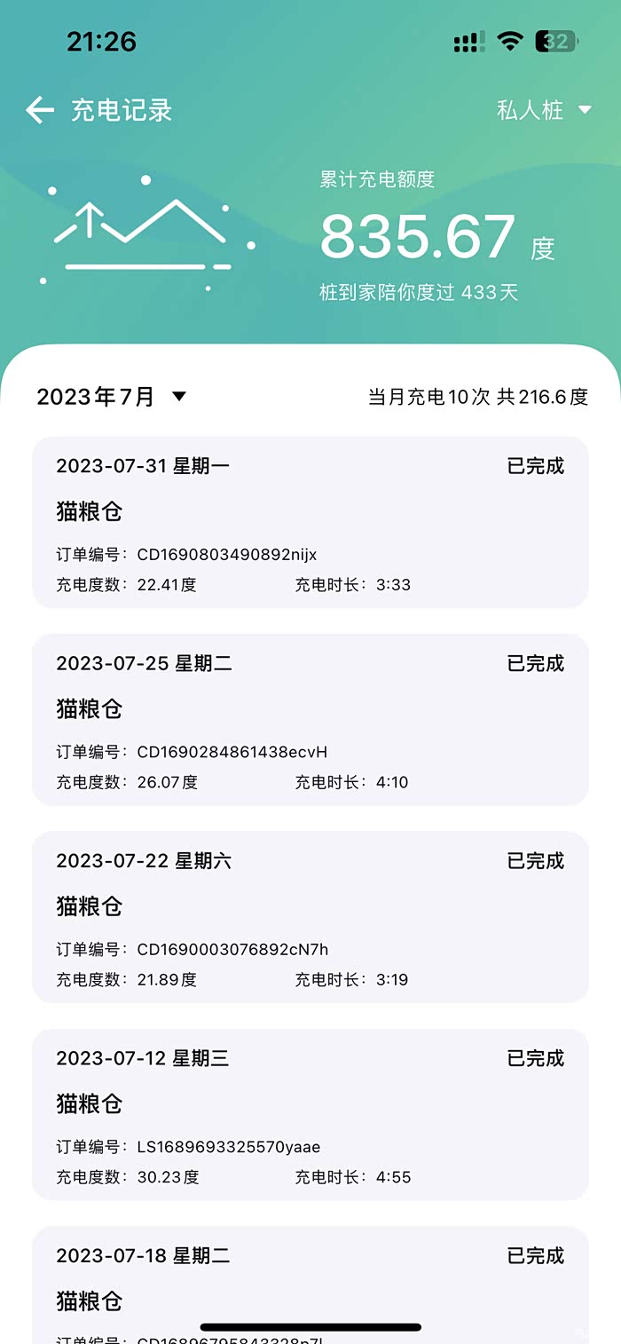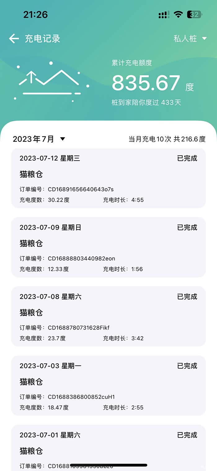 以7月为例吧,因为工作外出市区的次数多了,家人身体不舒服,跑医院的次数也多,所以7月充了10次电,充了216度电,众所周知,电池充电达到80%以上的充电速度是很慢的,所以我基本充电都是30%冲到80%就结束,提前规划好第二天的用车情况,有家充,基本没有续航焦虑。