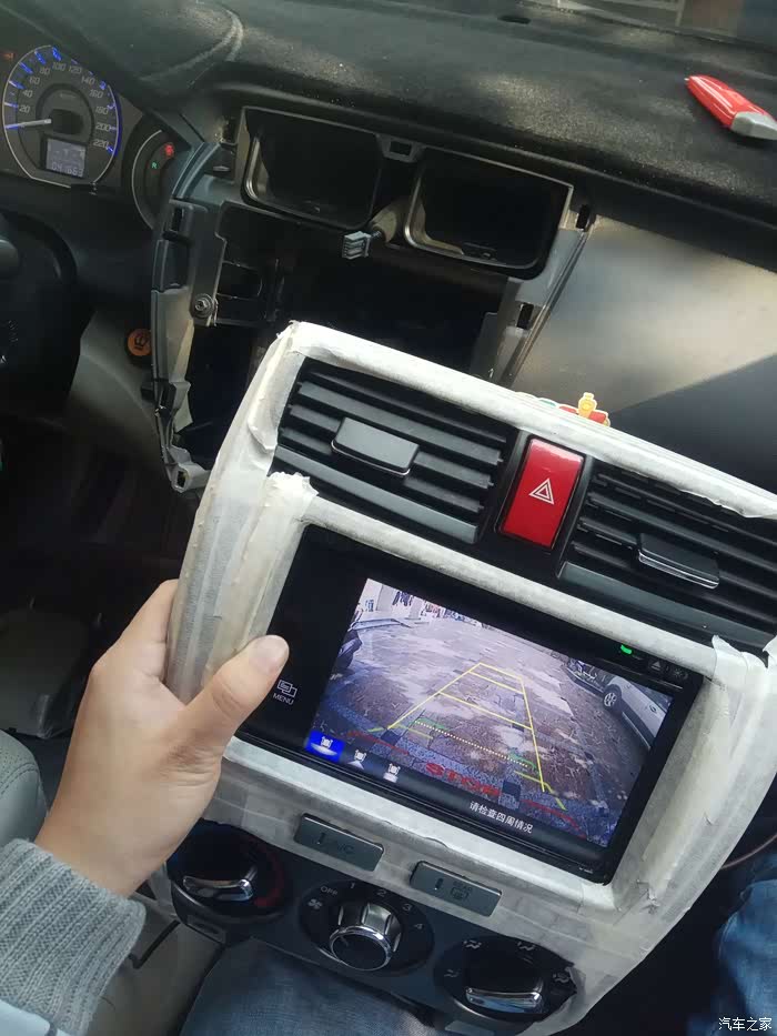 对着位置挂在上面,卡扣装不上,里面顶着,位置不对。初次把原车的电源线接上,能开机,能用收音机,倒车、胎压什么的都不能用