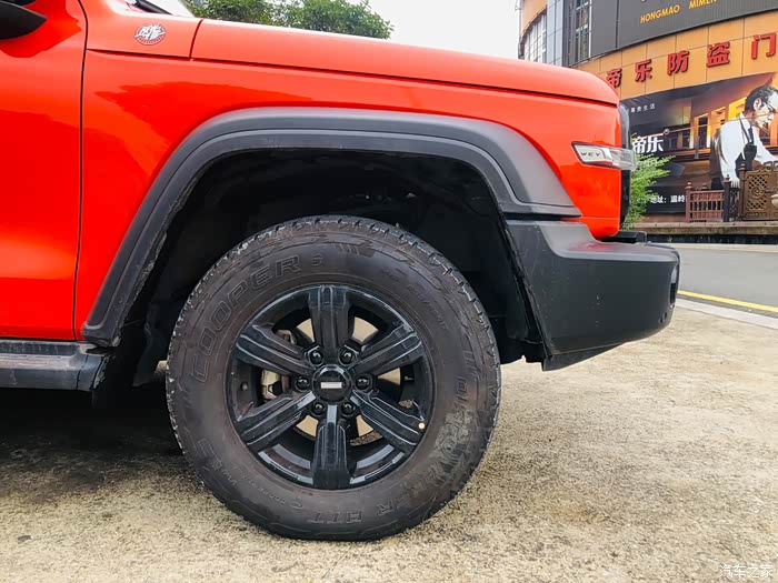 17寸六幅的熏黑轮毂 个人认为还是不错的 搭配的是选装的固铂att轮胎 可以应付中轻度的越野需求 公路操控性也不差