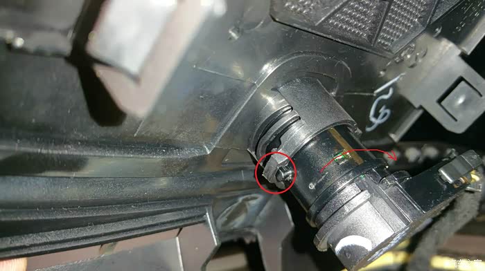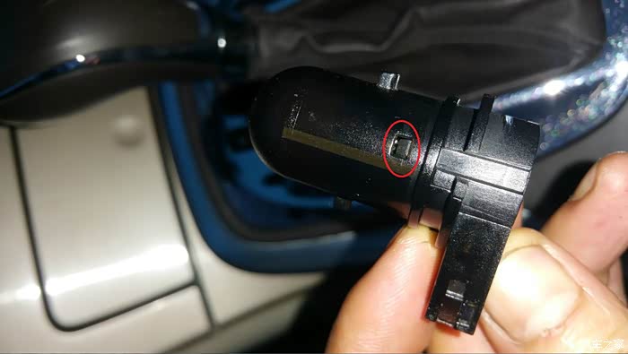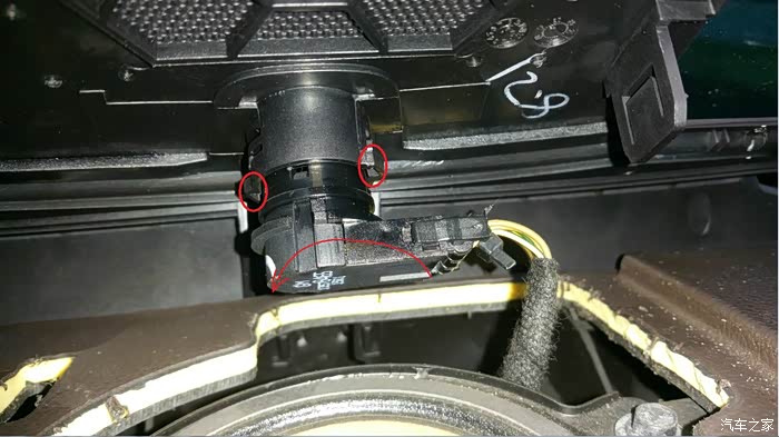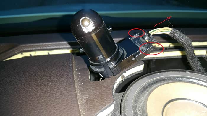 盖子拿上来后就能看到自动大灯的光线感应器了,转动一下感应器卡子对准盖子的那两个红圆圈标注的槽向下用力就能拔出来