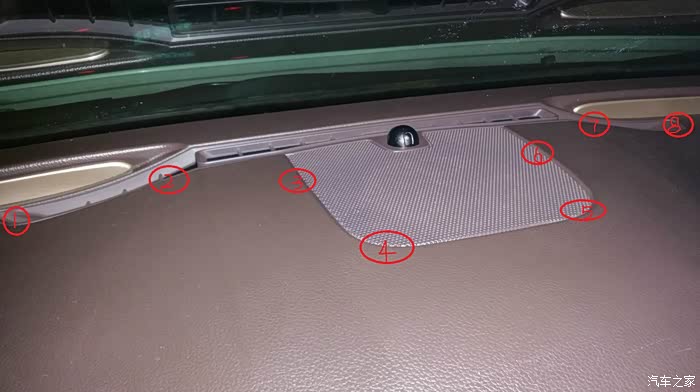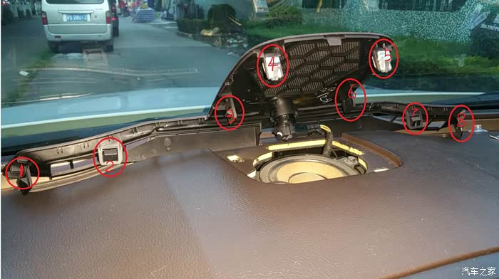 中控中音喇叭盖子一共用8个卡子卡在中控台上,按照标位置一个一个把它撬起来(注意不要刮花中控台哈)