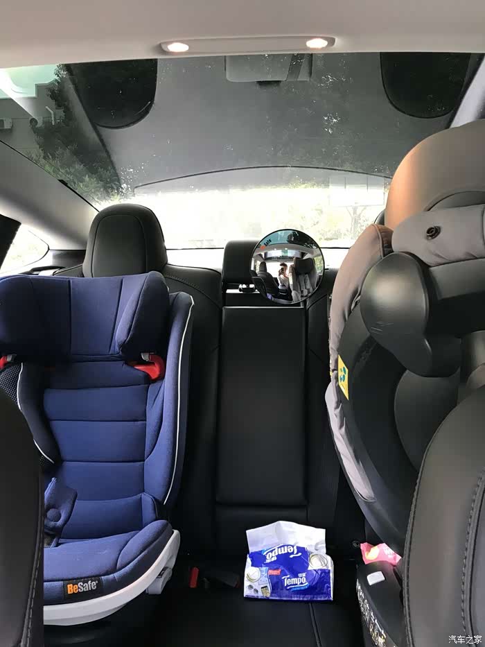 空间,绝对够用。我身高180+,前排调整到非常舒展的位置后,后排依然放得下反向大块头IFOX安全座椅,而且model 3后排座椅可以放倒、有两个IFOX接口。头部空间更好,因为整个车顶几乎都是全景玻璃。当然我比较瘦,150斤。
