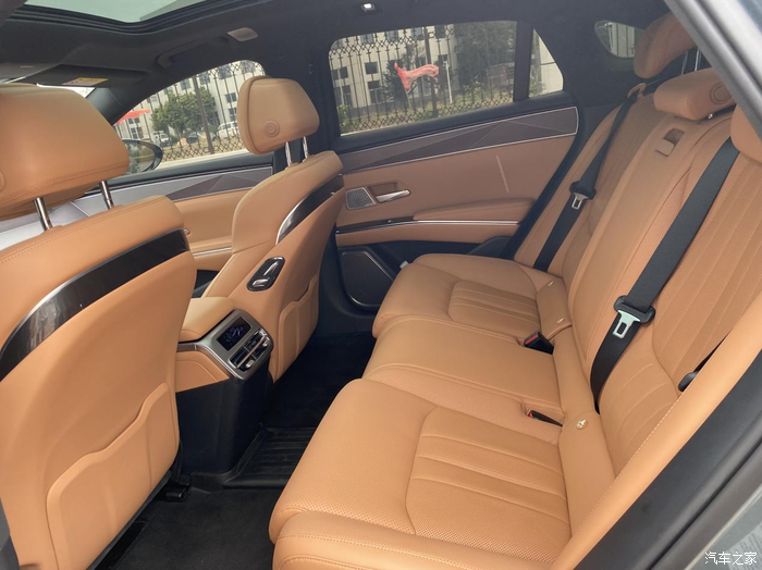 这车空间利用率还是挺优秀的,就拿后排来说,地面相对比较平,就算坐三个人,中间那位也不会难受。空间足够宽敞,我这种身高超过180CM、体重接近200斤的体型也照样坐得很得劲儿。把扶手拉下来之后有块屏幕,可以在这里打开按摩加热等功能,也可以控制车内的氛围灯和音乐,这个设计我真的服气。
