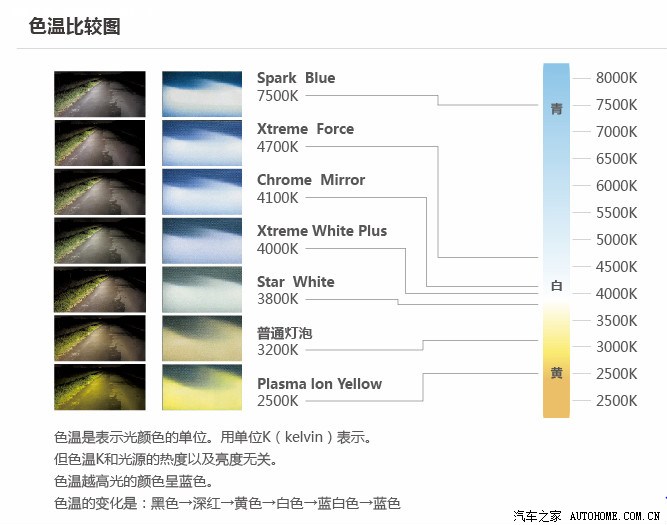 色温选择不能太低,因为已经受够了豪华508的大黄眼了,当然色温也不能太高,太高的色温导致照射距离太近,有安全隐患。