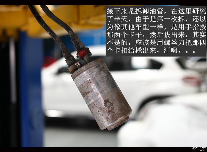 小福车友要注意一下,这卡扣是要撬出来的哦,很多车的卡扣是用力按下去的,很大的不同,拔油管也要注意一下,毕竟油管里有一点压力的,别让汽油淋到身上。