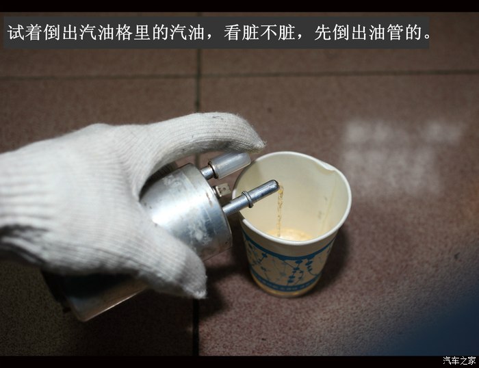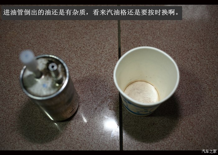 两个油管倒出的油对比,汽油格还是能很好的过滤杂质的。