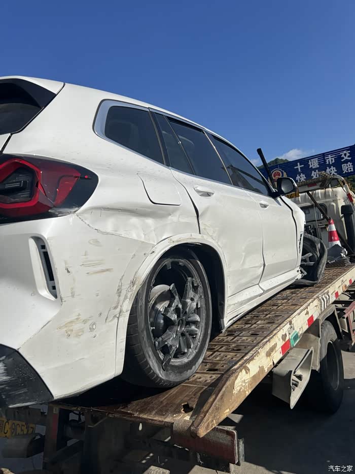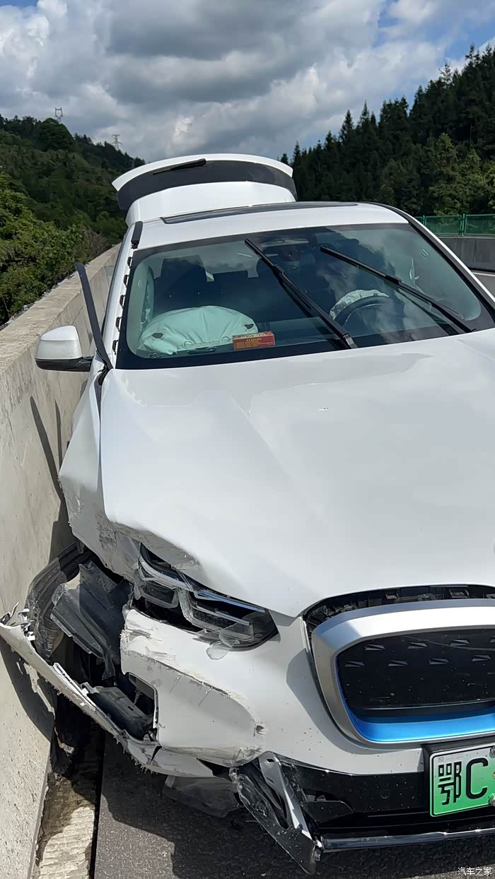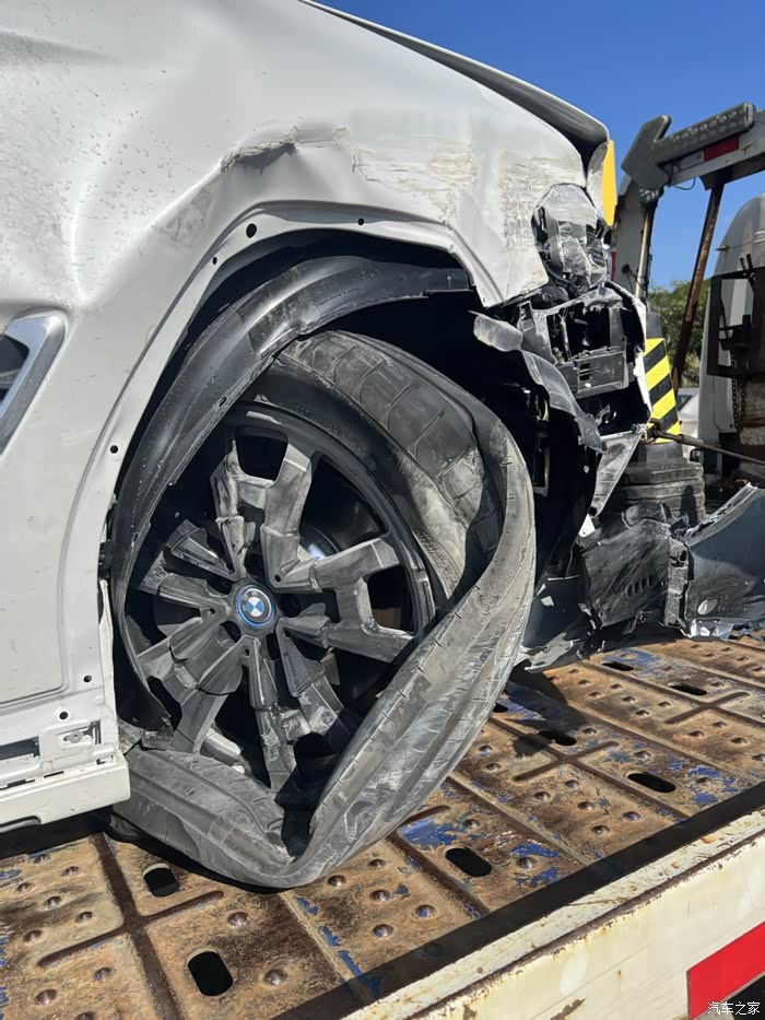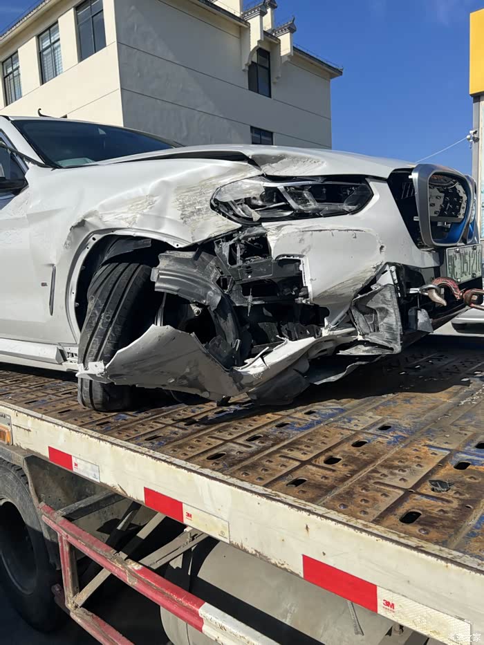 出事后宝马售后经理和维修师傅很快赶过来,毕竟我是他们店里卖出去的第一台IX3,师傅跟过来主要是关闭电池的高压电什么的,具体不是很懂。本地的4s店才拿到电车的授权,对电车的维修也不是太懂。看到车伤成这个样子,我的第一反应是想直接报损,但我之前的车十年没报过一次保险,对报全损没有经验啊,问了很多人也都是理论派,都是道听途说。这车的保险买的是人保的,当时问人保的勘察员能不能全损,他说车要拉回市里,这个单子也会转交到市里,具体修还是全损,由市里决定,再问就是些模棱两可的话,说自己要求全损的话,最后不一定按保额全赔。再问宝马售后经理,说可以修,还能修的完好如初,那就先拉回4s店再说。这里要提醒一下各位车友,如果车子损伤重,直接强烈要求当时定损的勘察员定全损,由保险公司来负责后续的事情,车子只要拉回4s店,之后再全损的话,一系列的纠纷也就随之而来了。