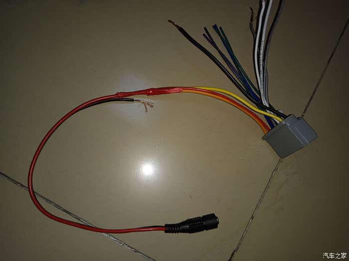 买的供电插口,里面有很多种颜色,但是主要是用来供电和音频输出的,黄色是正极供电,红色是ACC钥匙检测,橙色是面板按钮灯的,一起接到电源正极上面,用胶布缠好,我买了供电的转插口,如果不买也可以直接伸到电源里面的接口缠好胶布就可以了。