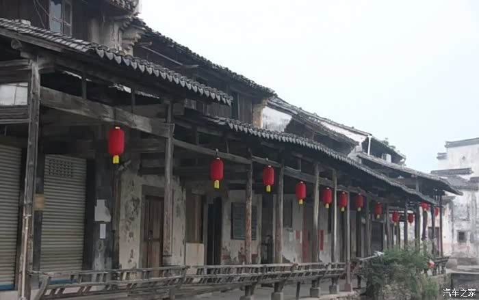 近百幢徽派建筑均匀地散布在小溪两岸,民居、祠堂、店铺、油坊,高低错落又井然有序,沿街还有40余米的避雨长廊,
